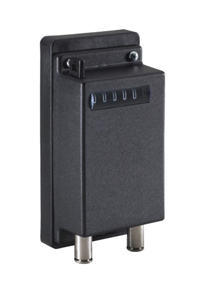 Compteur totalisateur pneumatique, 6 positions. Commande pneumatique/mécanique. 2 orifices, fréquence de comptage en fonction de la pression et de la longueur de la conduite. Réinitialisation manuelle ou pneumatique. Raccordements par des connecteurs auto-étanchéifiants de 4 mm. Système de fixation pour plaque à gorges. Norme industrielle