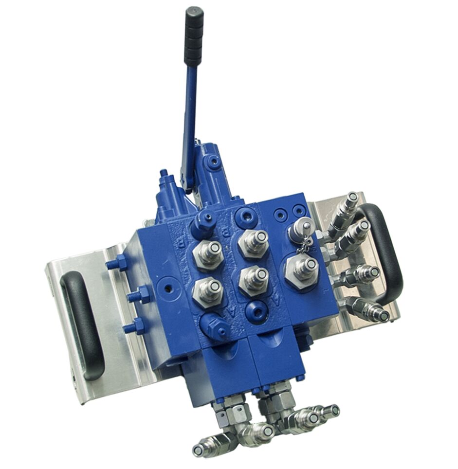 Bloc-fonction mobile Load Sensing 2M4-12. Bloc-fonction pour la commande LS (LS). 1 élément d’entrée, 1 élément d’extrémité avec décharge LS. 2 éléments de distributeur avec 1 commande hydraulique et 1 commande manuelle, 4 fusibles secondaires (2 réglables), 1 élément de distributeur avec valves de pression LS, limitations de course paramétrables. Connexions par des raccords rapides auto-étanchéifiants. Système de fixation stable pour la grille. Norme industrielle