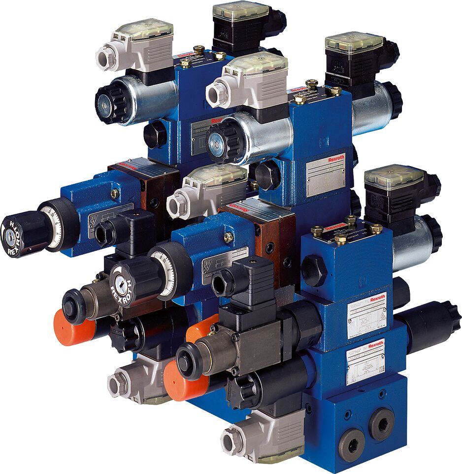 Calibre 6, 8 empilages en hauteur. Commandes hydrauliques compactes pour 8 empilages en hauteur du calibre 6. Élément pour commandes prêtes à être raccordées par empilage en hauteur. Bloc de commande hydraulique compacte. Conduite commune du réservoir et de la pompe. Raccords de consommateur séparés des stations