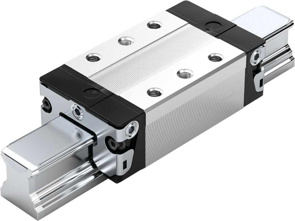 Guide à billes, SNS, taille 15, aluminium, précision élevée, faible précharge, sans cage à billes. Le guide à billes en aluminium est très précis et de poids réduit en comparaison avec l’exécution en acier. En outre, il se distingue par les caractéristiques du produit suivantes:. Taille de construction 15. Modèle SNS: Largeur = étroit, longueur = normal, hauteur = standard. Corps du chariot de guidage en aluminium. Classe de précharge C1: Faible précharge. Classe de précision H: Élevée. Sans cage à billes. Première lubrification et conservation. Graisse pour roulements à billes Dynalub 510. Sans élément à rapporter à gauche (bord de butée avant). Sans élément à rapporter à droite (bord de butée avant). Raccordement de lubrification droit fourni en vrac.. Corps du chariot de guidage en version standard. Longueur totale du chariot de guidage = 58,2 mm. Construction interchangeable: Les chariots de guidage et les rails de guidage peuvent être combinés entre eux dans chaque précision.. Domaine d'application: Pour constructions légères – Pour la compensation des tolérances plus étroites des constructions périphériques. Variations réduites de la déformation élastique grâce à la forme optimale de la zone d'entrée et au nombre élevé de billes. Construction légère particulièrement compacte: Gain de poids de 60 % par rapport aux guides à billes en acier. Précision très élevée. Zone d'entrée brevetée, permettant d'augmenter la précision du déplacement jusqu'à un facteur de six. Convient pour tous les rails à billes SNS. Raccordement de lubrification sur toutes les faces, avec taraudage métallique. Les guides à billes sont lubrifiés en usine. Éléments rapportés à fixation par le haut sur le guide à billes. Interchangeabilité illimitée grâce aux nombreuses possibilités de combinaison de toutes les exécutions de rails à billes avec toutes les variantes de guides à billes dans chaque classe de précision. Excellentes valeurs dynamiques. Lubrification minimale avec dépôt intégré en cas de lubrification à l'huile. Trous prépercés sur le guide à billes pour le goupillage. Écarts de parallélisme et de hauteur supérieurs au niveau des surfaces de montage admissibles. Lubrification longue durée possible sur plusieurs années. Classes de précision H et N pouvant être combinées avec tous les rails de chaque classe de précision