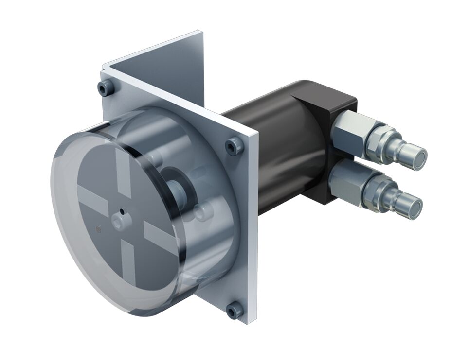 Moteur planétaire. Moteur hydraulique (moteur planétaire), pour un sens de rotation vers la droite et la gauche. Arbre du moteur avec disque et bandes réfléchissantes, couvercle de sécurité capable de recevoir un capteur de vitesse de rotation optionnel (R900892375). Connexions par des raccords rapides auto-étanchéifiants. Système de fixation stable pour la grille. Norme industrielle
