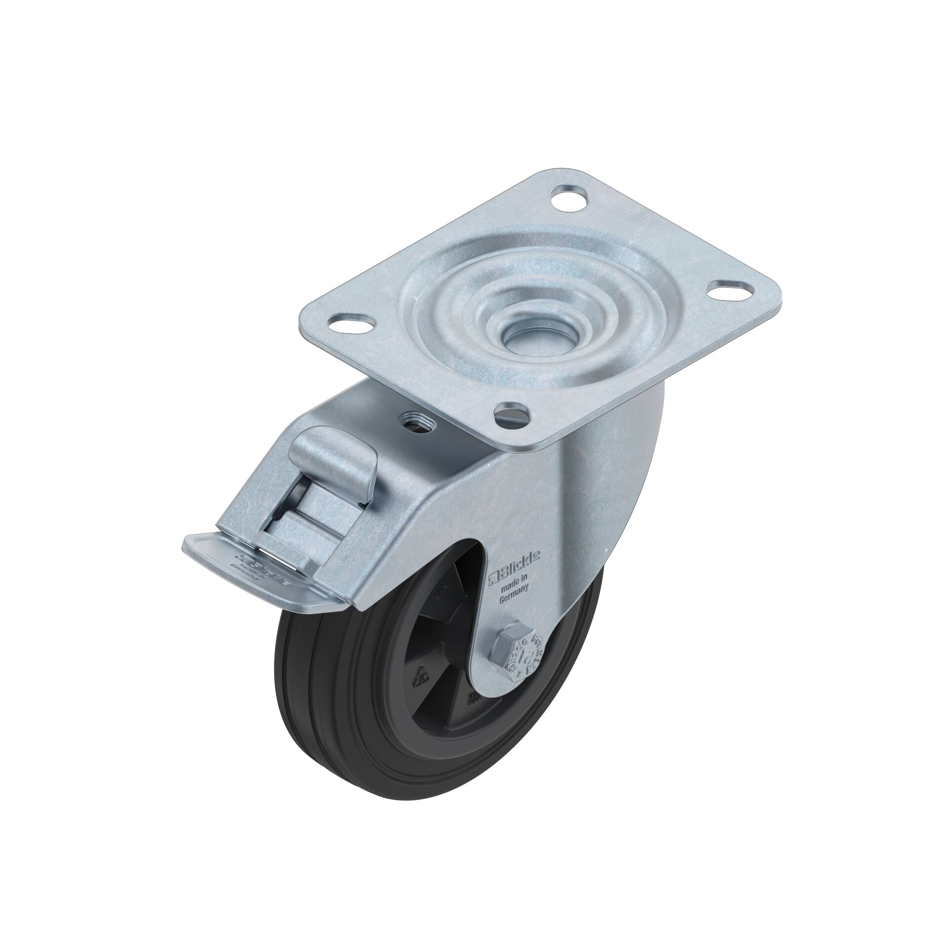 Roue avec bride de montage, roulette, F600. Roue avec bride de montage, roulette, F600. Roues robustes avec bride de montage. Bonnes propriétés de roulement, particulièrement adaptées aux ateliers. Disponibles comme roulettes avec frein ou roues fixes. Roulette avec frein : Dispositif d'arrêt empêchant la roue de tourner et de pivoter