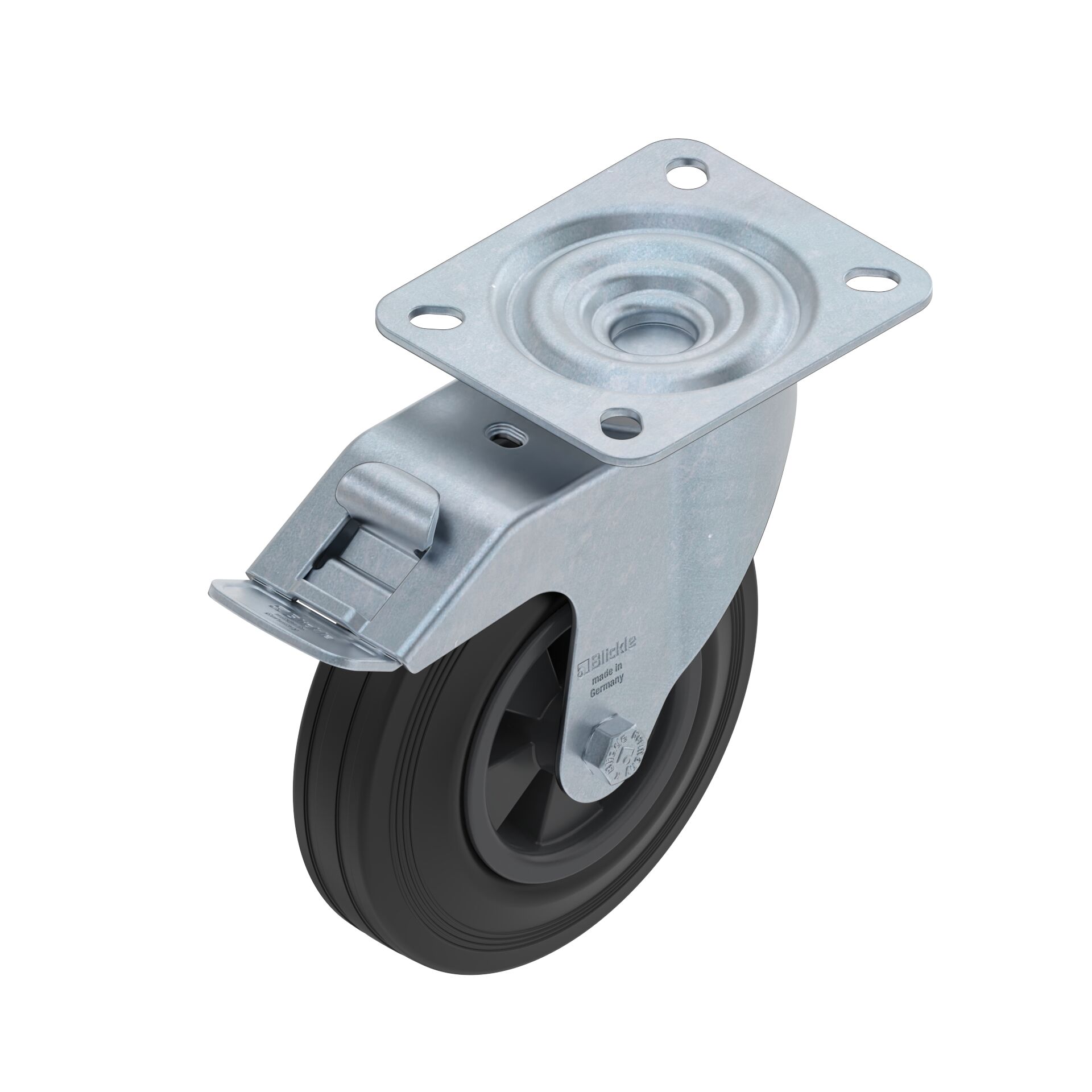 Roue avec bride de montage, roulette, F900. Roue avec bride de montage, roulette, F900. Roues robustes avec bride de montage. Bonnes propriétés de roulement, particulièrement adaptées aux ateliers. Roulette avec frein : Dispositif d'arrêt empêchant la roue de tourner et de pivoter