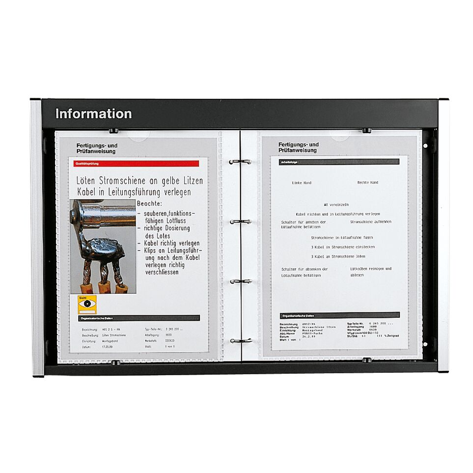 Tableaux d'information 2xA4 plus. Tableaux d'information 2xA4 plus. Pour la mise à disposition d'informations au poste de travail, chariot de transport du matériel ou rayonnage de supermarché. Stabilité élevée. Montage vertical ou horizontal. Tableau d'information 2xA4 plus : Modèle à deux pages avec mécanisme à 4 anneaux DIN A4 ; emplacements pour tableaux de remarques