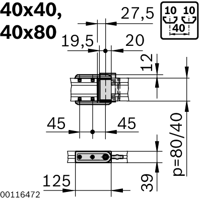Articulation du bras d'appui 40x80 standard. Articulation du bras d'appui 40x80 standard. Pour raccords profilés sur face avant orientables, p. ex. pour le montage de bras d'appui. Usinage des profilés : Trou traversant D17