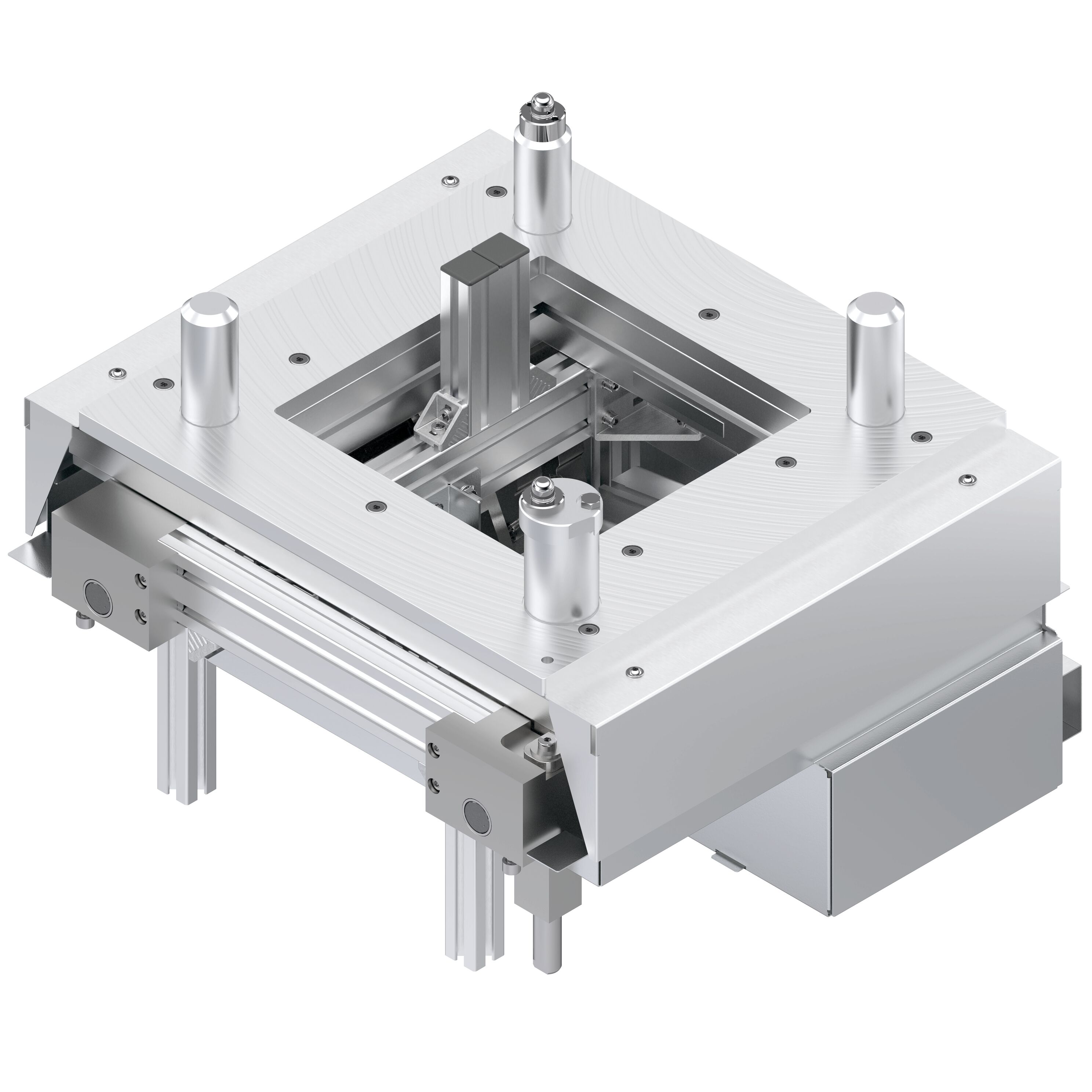 Unité de positionnement PE 5/OC. Unité de positionnement PE 5/OC. Positionnement d'une palette porte-pièces en transport longitudinal dans un poste de travail manuel ou automatique avec des exigences élevées concernant la précision de positionnement (± 0,3 mm). Utilisable pour toutes les palettes porte-pièces WT 5. Montage par le bas. Levée au-dessus du niveau de transport : 5 mm. Précision de positionnement: ±0,3 mm dans les directions x et y. Force de traitement verticale admissible en cas de charge centrée: jusqu'à 4000 N. quel que soit le poids de la palette porte-pièces WT. Adapté pour ST 5/OC. Raccord d'air comprimé : 5 ... 6 bar. Raccordement enfichable pneumatique: 8 mm