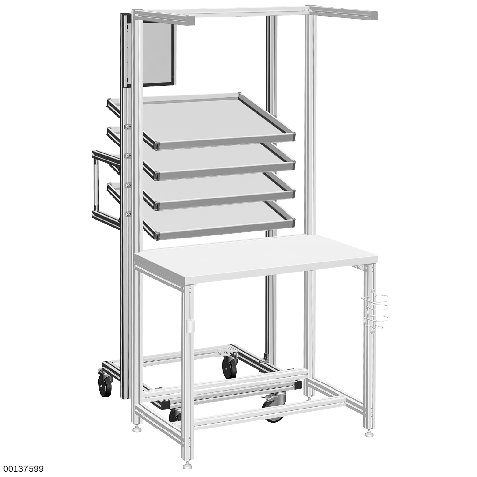 Chariot de transport du matériel poste de travail. Chariot de transport du matériel poste de travail. Mise à disposition des pièces dans l'espace de préhension au poste de travail. Temps d'équipement réduits grâce à l'alternance rapide de chariots de transport du matériel préparés à l'avance. Peut être équipé et dimensionné de manière personnalisée. Version disponible avec conductibilité ESD. Version : Entièrement monté ou en kit à monter soi-même. Au choix avec tableau d'information pour la mise à disposition sur site des informations. Préhension ergonomique dans les niveaux de matériaux réglables en hauteur, déport avant/arrière et inclinaison. Niveaux de matériaux Basic avec clip de marquage ; différents plateaux au choix. Roulettes : Sur roulements à billes, avec dispositif de blocage. Combinable avec le poste de travail ou pour la mise à disposition des pièces en association avec le flux manuel des pièces EcoFlow