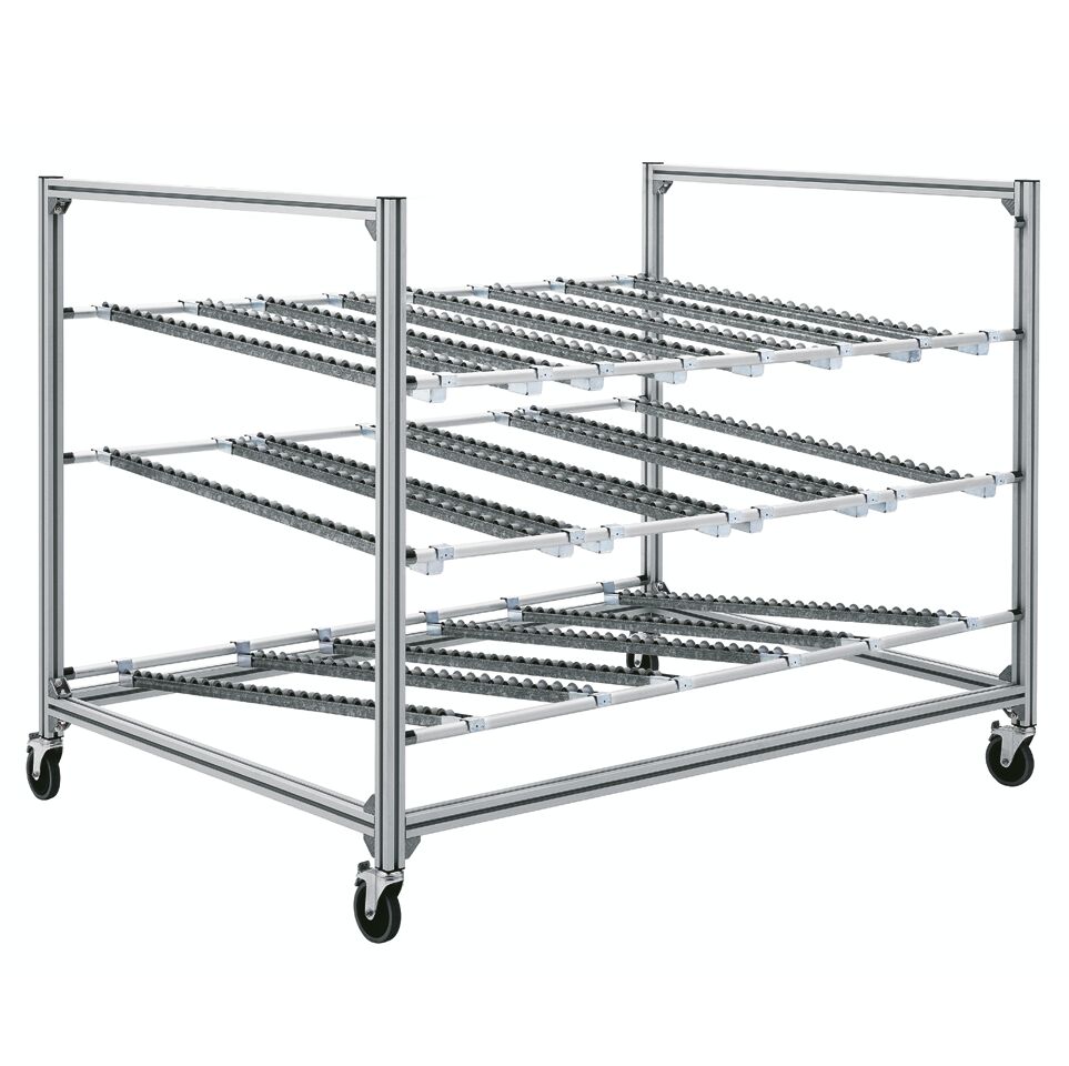 Rayonnage XLean. Rayonnage XLean. Mise à disposition des pièces en supermarché ou directement au poste de travail. Solution économique avec voies de convoyage en profilés en acier et rouleaux en plastique. Version disponible avec conductibilité ESD. Version : Entièrement monté ou en kit à monter soi-même. Possibilité d'extension avec des modules comme les traverses et les voies de convoyage ainsi que des composants individuels