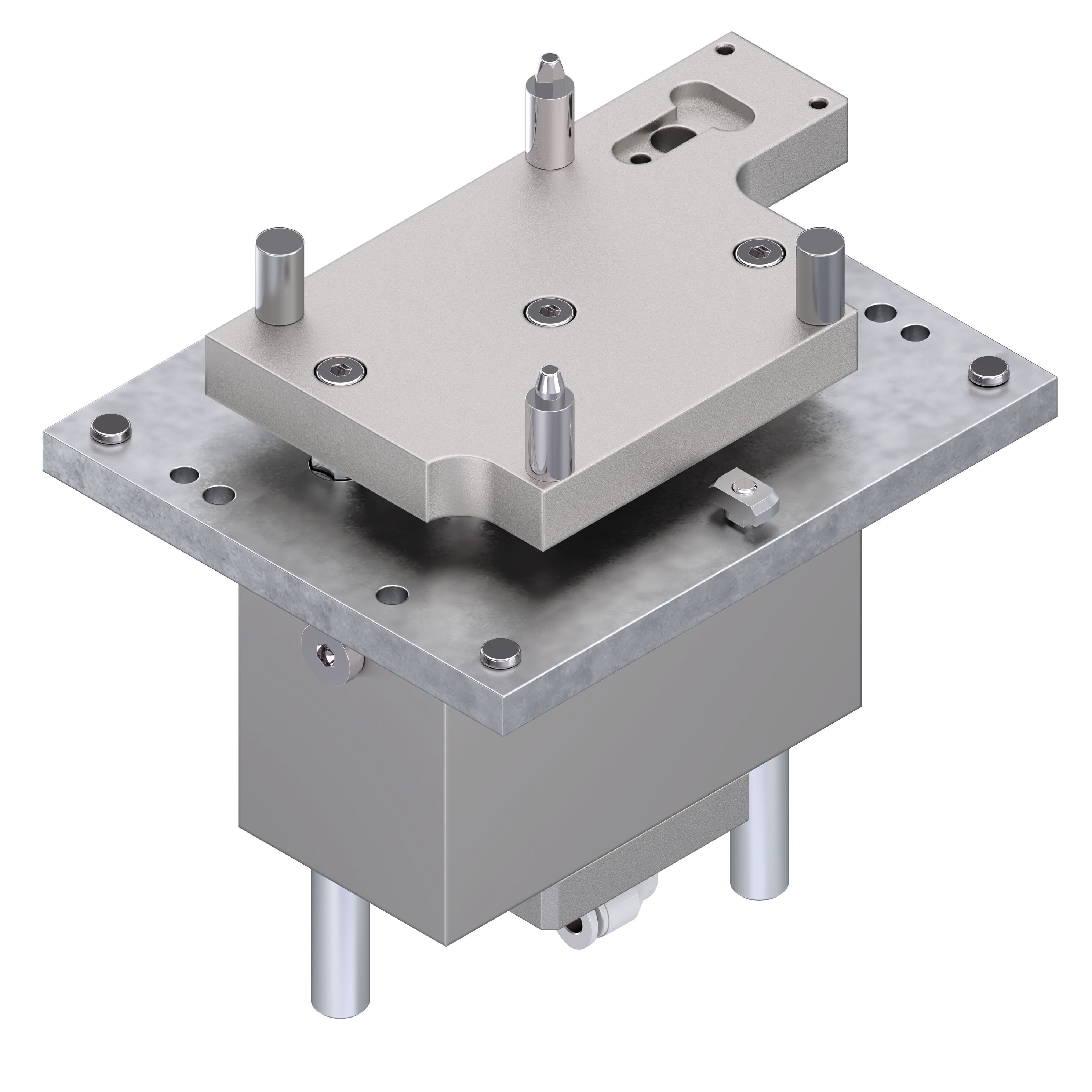 Unité de levée et de positionnement HP 1/P h = 15 mm. Unité de levée et de positionnement HP 1/P h = 15 mm. Utilisable avec les palettes porte-pièces WT 1/P. Positionnement via les tiges de positionnement de la HP 1/P et les douilles de positionnement de la palette porte-pièce WT 1/P. Force de processus verticale admissible jusqu'à 400 N avec WT 1/P. La plaque de positionnement de la HP 1/P soutient alors la WT 1/P sur sa plaque-support.. Précision de répétabilité dans le sens X et Y : ± 0,025 mm. Butée fixe pour le prépositionnement de la palette porte-pièces qui arrive. Peut si besoin être remplacée par un amortisseur DA 1/B.. Pour la HP 1/P dans la version avec course variable, la hauteur de levée au-dessus du niveau de transport est de max. 50 mm. La hauteur de levée est réglable en continu.. La version avec hauteur de levée fixe de 15 mm au-dessus du niveau de transport présente une hauteur de construction particulièrement faible. Elle convient donc tout particulièrement à une utilisation sur des postes de travail manuels sans entraver la liberté des jambes.. La HP 1/P possède trois positions :- Position inférieure : Les WT sur la section peuvent passer.- Position médiane : Les WT sont arrêtées sur la section (par une butée fixe intégrée ou en option avec l'amortisseur DA 1/B). La position médiane peut non seulement être approchée par la position inférieure mais aussi par la position supérieure.