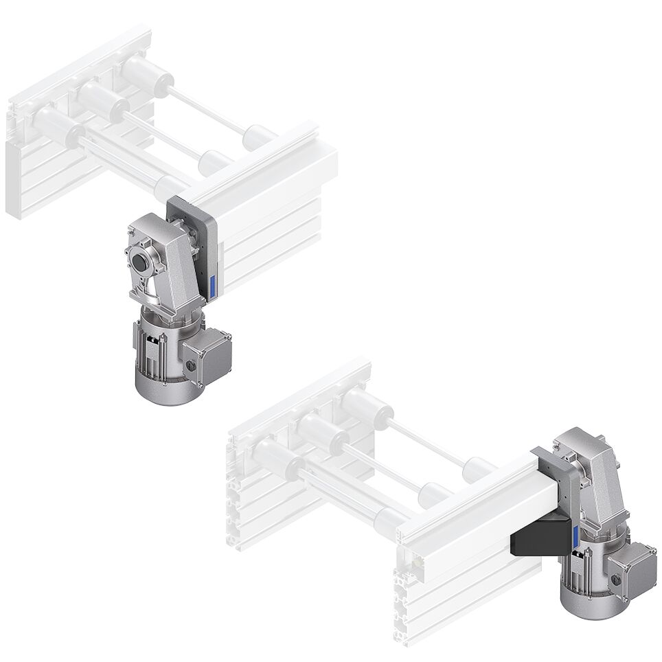 Kit d'entraînement AB 5. Kit d'entraînement AB 5. Pour l'entraînement sur face avant des unités de section traverse de profilé 5/… et CU 5/…. L'adaptation des pièces en tôle est prérequise. Adapté pour un fonctionnement réversible (max. 20 Nm). Avec le moto-réducteur Lenze (GM = 1)ou avec l'interface pour le montage d'un moto-réducteur SEW (GM = 2). Raccordement de moteur par connecteur (AT = S) ou par bornier de connexion (AT = K). Variateur de fréquence en option. Remarque:. - Longueur maximale de la section totale entraînée pour p = 130 et 45 Nm de puissance du moteur = 19,5 m (sections plus longues sur demande). - Adapté pour l'entraînement de deux courbes reliées