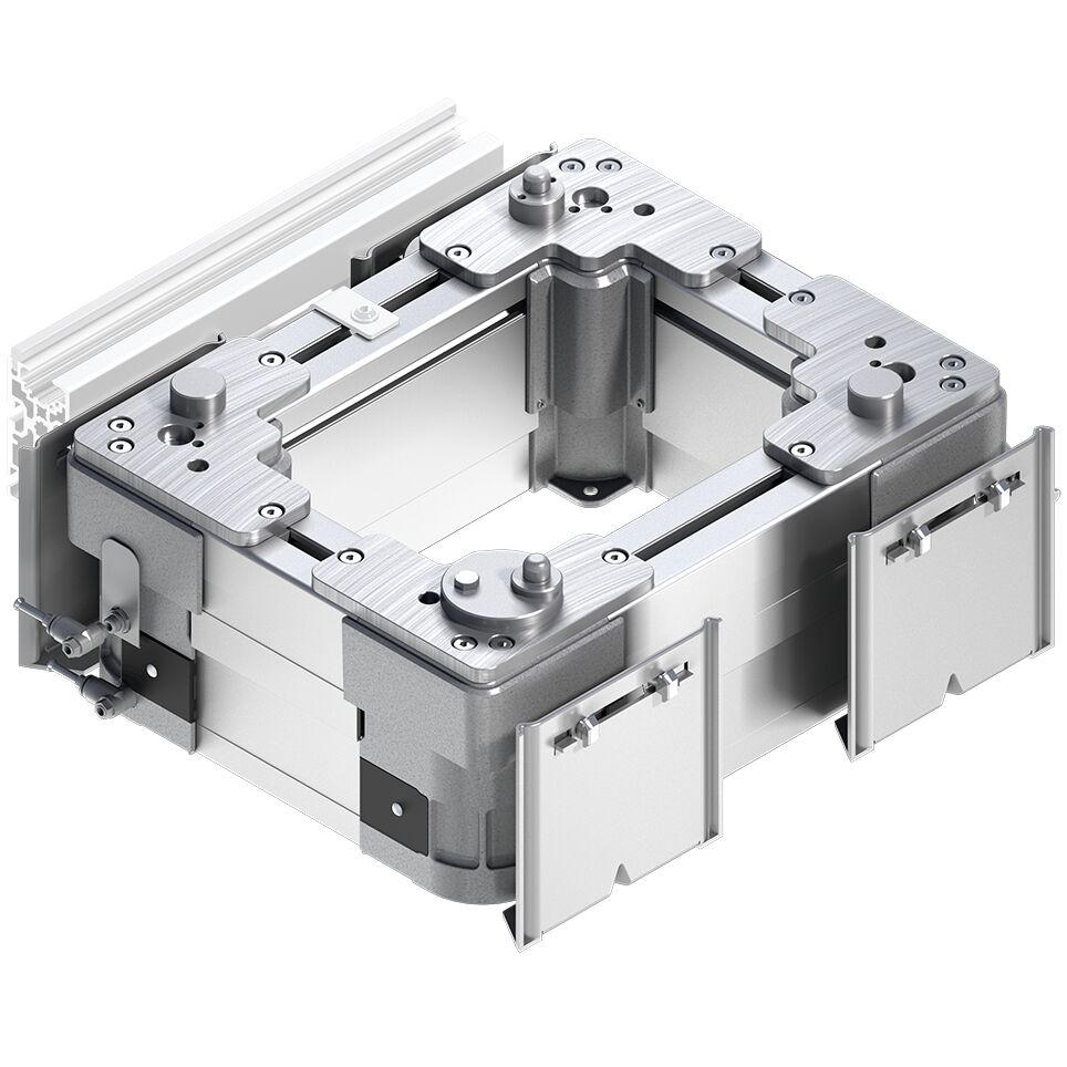 Unité de positionnement PE 2/H. Unité de positionnement PE 2/H. Pour le positionnement d'une palette porte-pièces dans un poste d'usinage manuel/automatique. Précision de positionnement jusqu'à ±0,1 mm en cas de montage sur un bâti de machine séparé. Levée de la WT au-dessus du niveau de convoyage env. 3 mm. Positionnement via les tiges de positionnement de la PE 2 et les douilles de positionnement de la palette porte-pièces WT 2/.... Alésages de fixation sur le cadre de levage comme position de vis optionnelle pour bâti de machine séparé. Force de processus verticale admissible : 3500 N avec WT 2/…. Combinable avec toutes les palettes porte-pièces WT 2/H et WT 2/F-H
