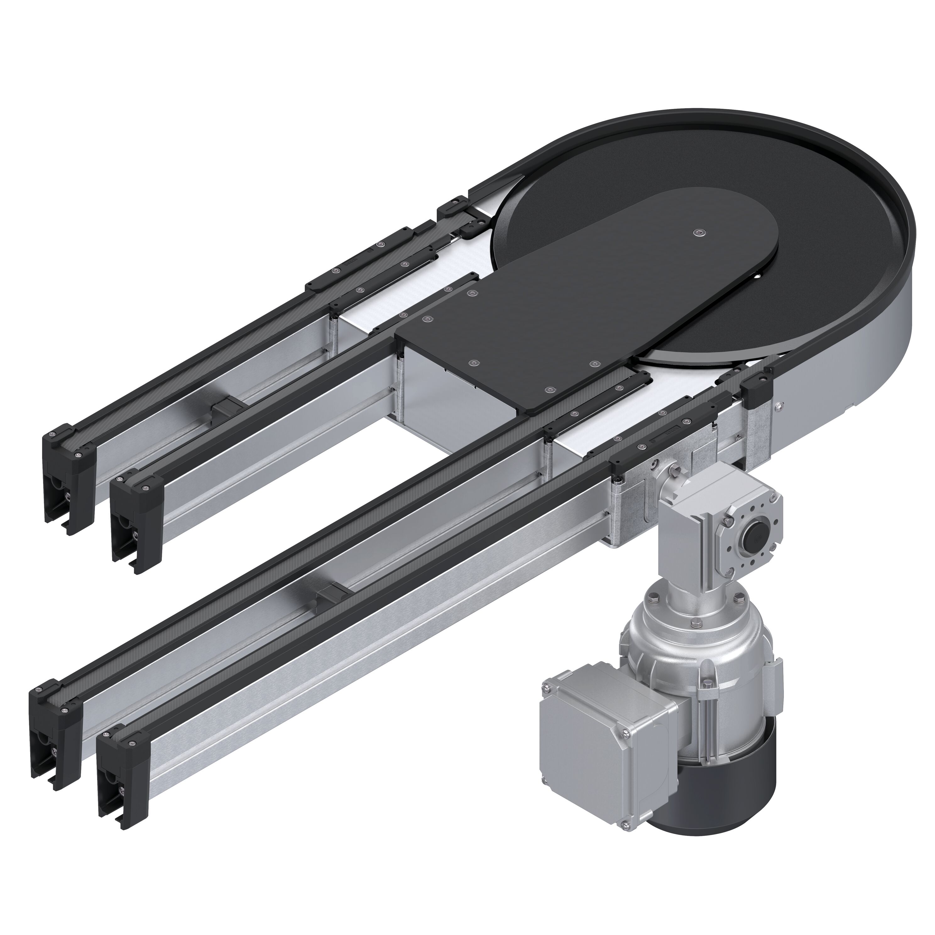 Courbe de 180° pouvant fonctionner en accumulation avec entraînement propre.. Courbe KU 1/180 avec entraînement propre pour le transport à courbe de 180° d’une palette porte-pièces. La /KU 1/180 peut fonctionner sans commande coûteuse grâce à sa capacité à l’accumulation. Elle convient également à une utilisation pour les applications ESD. Fonctionnement réversible impossible. En cas d’immobilisation (p. ex., fin de service), aucune palette porte-pièces WT ne doit se trouver sur la courbe.. Largeur de bande a = 135 mm. Entraînement commun intégré pour la plaque tournante et les sections à bande montées dans la section d'alimentation et la section d'écoulement. Charge de section jusqu'à 30 kg. Moyen de transport : plaque tournante, appropriée pour une utilisation en EPA. Longueur de la section d'alimentation et de la section d'écoulement au choix, lmax = 5000 mm. Sens de la courbe à droite (KR = R) ou à gauche (KR = L). Montage du moteur à l'extérieur (MA = A)