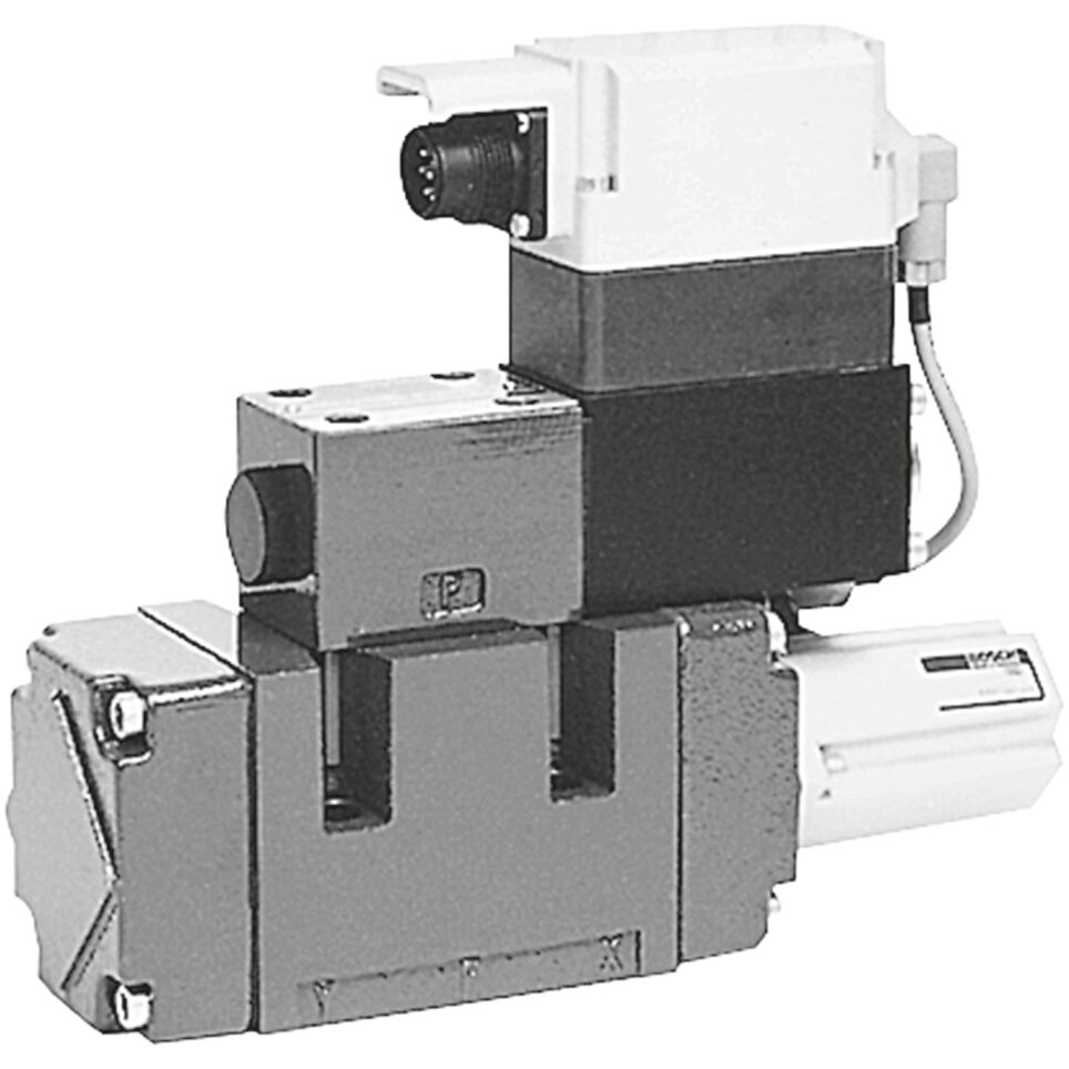 Calibre 10, symbole V, électrique avec électronique intégrée, 24 V CC. Valve hydraulique industrielle dans une plage de puissance élevée, régulation fiable de la direction du débit d’huile conformément au symbole hydraulique, haute précision par rétroaction interne de la position du piston.. Distributeur à tiroir. Piloté. Progressif avec plage de commande de précision linéaire. Alimentation externe d’huile de commande, retour externe d’huile de commande