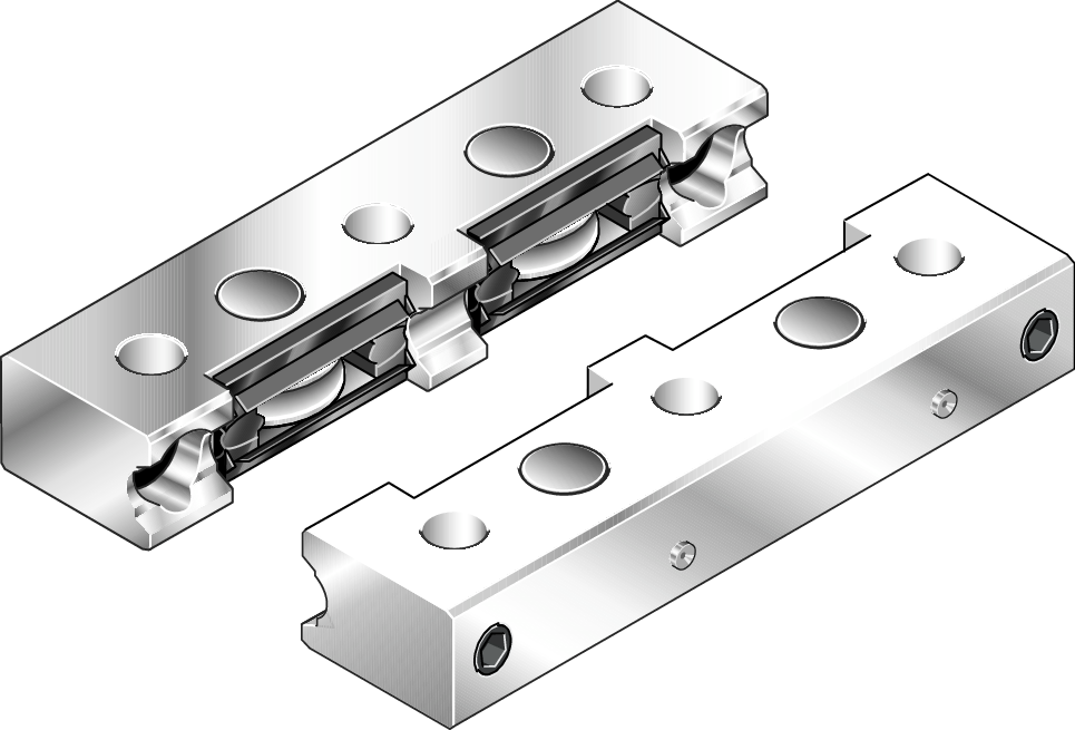 La cassette double du guide à galets possède les propriétés suivantes: Modèle SNS, taille 52, aluminium, précision Economic, classe de charge FH. La cassette double du guide à galets possède les propriétés suivantes:. Taille de construction 52. Modèle SNS: Largeur = étroit, longueur = normal, hauteur = standard. Corps du chariot de guidage en aluminium. Capacité de charge élevée. Classe de précision E: Economic. Sans conservation. Sans lubrification initiale. Sans élément à rapporter à gauche (bord de butée avant). Sans élément à rapporter à droite (bord de butée avant). Graisseur intégré. Exécution standard. Longueur totale du chariot de guidage = 184,5. Élément interchangeable. L'écartement des cassettes sur les plateaux peut être adapté à volonté. Réglage sans jeu à l'aide de vis à six pans creux sur l'arrière des cassettes.. À haute étanchéité périphérique, effet de raclage excellent. Lubrification de préférence à la graisse.. Sur deux demi-rails
