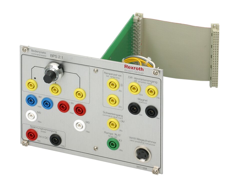 Module de commande BPS 2.1, adaptateur pour amplificateur de régulation analogique VT-VRPA1, 34TE. Pour transférer les raccords de l’amplificateur VT-VRPA1 aux prises bananes. Réglage des signaux de consigne par un potentiomètre 10 tours. Raccordement du capteur de position sur le distributeur et transfert des signaux à l’amplificateur. Réalisé selon la technique 19''. Prises bananes isolées