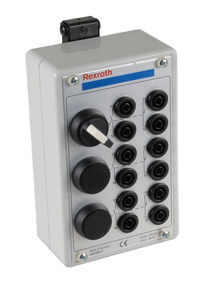 Élément de commutation variante à boîtier, 1 interrupteur + 2 boutons-poussoirs, 3 contacts de fermeture, 3 contacts d’ouverture. 1 interrupteur rotatif verrouillable, 1 contact d’ouverture et 1 contact de fermeture. 2 boutons-poussoirs avec rappel à ressort, 1 contact d’ouverture et 1 contact de fermeture. Boîtier avec système de fixation pour plaque à gorges. Prises bananes isolées