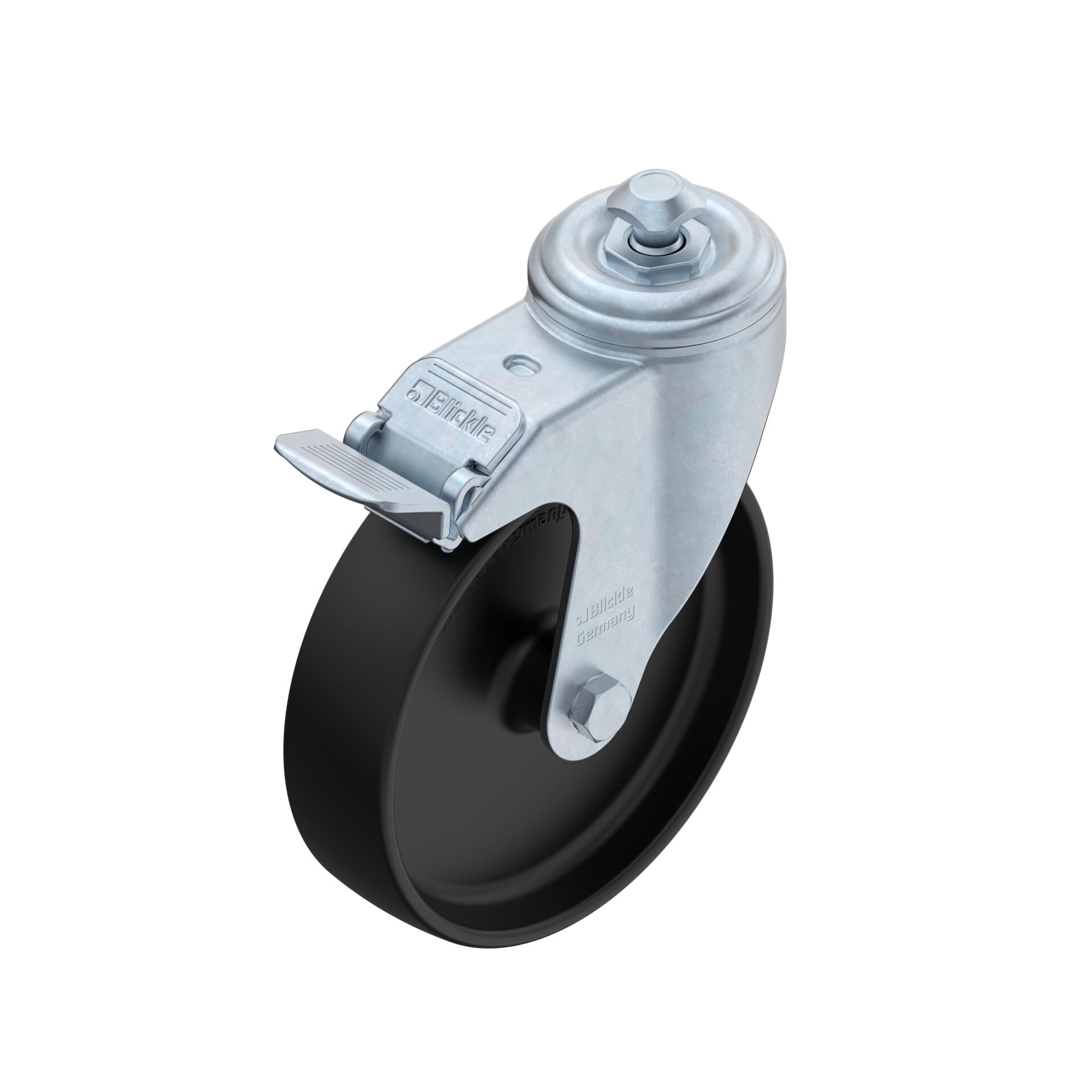 Roulette avec frein, PA renforcé, F1100. Roulette avec frein, PA renforcé, F1100. Résistant à l'huile, pour l'utilisation en atelier. Usage polyvalent. Roues présentant de très bonnes propriétés de roulement. Disponibles comme roulettes avec frein, roulettes ou roues fixes. Montage de toutes les roues dans la rainure de profilé ou dans l'alésage central de profilé (accessoires nécessaires). Usinage des profilés : Taraudage M12 en cas de montage dans l'alésage central de profilé. Roulette avec frein : Dispositif d'arrêt empêchant la roue de tourner et de pivoter