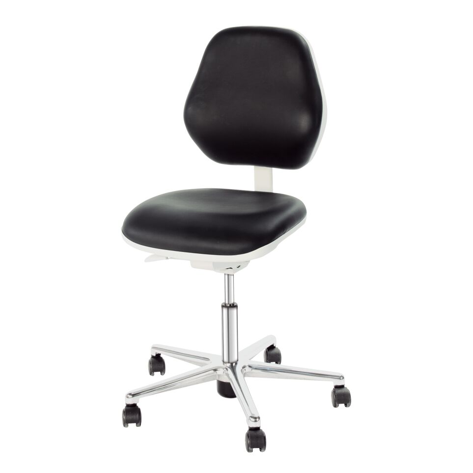Siège de travail pivotant Dynamic-Clean profond. Siège de travail pivotant Dynamic-Clean profond. Possibilités de réglage. – Hauteur d'assise. – Inclinaison d'assise. – Profondeur d'assise. – Hauteur du dossier. – Technique synchrone (mouvement synchrone du dossier et de l'assise). – Régulation du poids. Caractéristiques. – Charge max. admissible 120 kg. – Cuir souple, antidérapant et antistatique. Domaine d'application. – Salle blanche (classe de salles blanches ISO 4). – Fabrication de produits électriques et électroniques. – Résistance de fuite : 106 Ω
