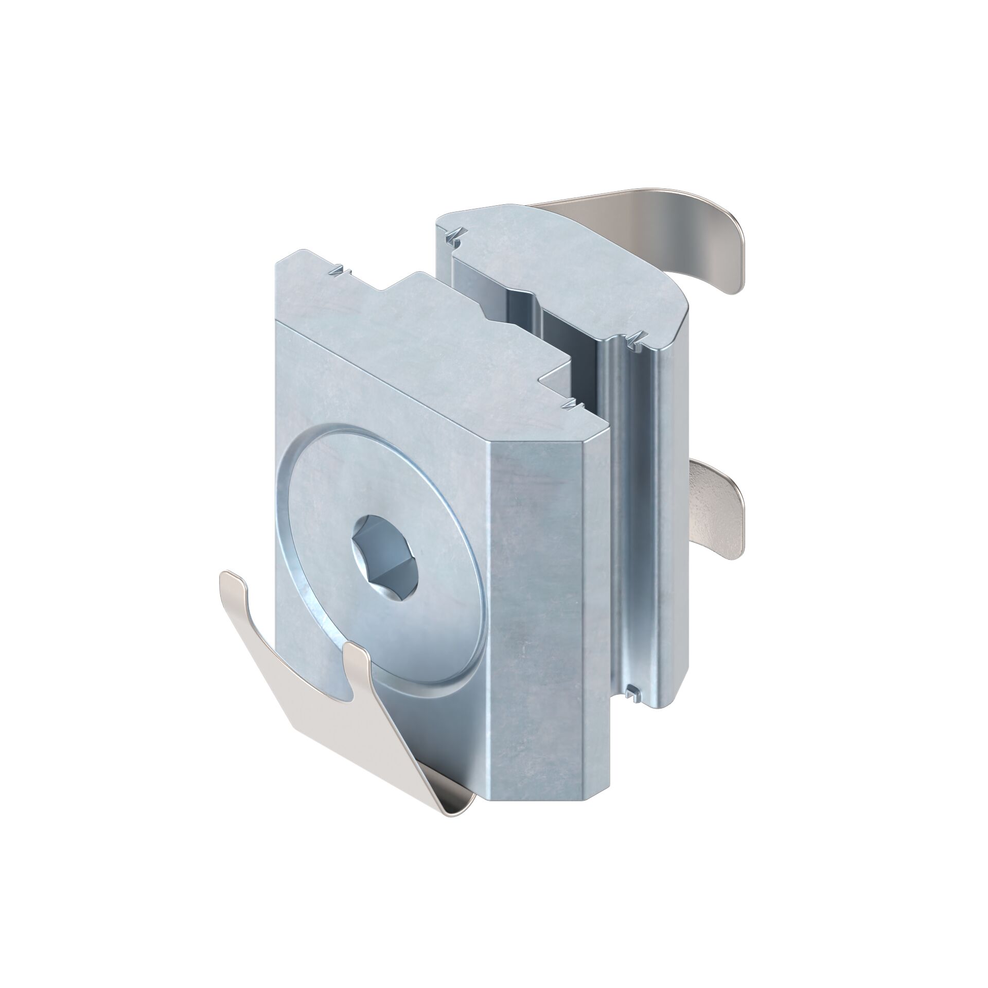 Connecteur parallèle N8. Connecteur parallèle N8. Pour une jonction sans jeu de deux profilés d'étayage, parallèle à l'axe ou selon un angle quelconque. Les connecteurs parallèles se composent de deux coulisseaux à ressorts soudés pour un montage simple. Jonction intérieure et esthétique, p. ex. pour les niveaux de matériaux. Jonction réalisable dans n'importe quelle position. Force de glissement transmissible par connecteur parallèle : 600 N. Usinage des profilés : Trou traversant