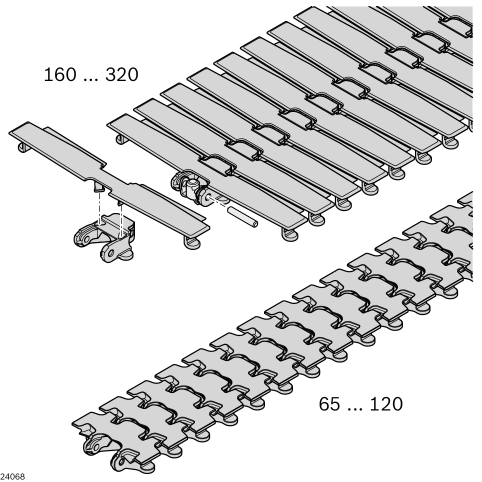 Chaîne de convoyage plate VFplus 90. Chaîne de convoyage plate VF. plus. 90. La chaîne de transport plate est utilisée pour le transport direct de produits ou pour le transport indirect à l'aide de palettes porte-pièces. La chaîne de transport grise est principalement utilisée pour le transport indirect par des palettes porte-pièces, notamment dans le cas de semelles en acier. Du fait de la coloration sombre, la surface de la chaîne ne subit presque aucune altération optique. Transport sur des sections montantes ou descendantes possible jusqu'à env. 7° en fonction du produit (test requis). Fonctionnement en accumulation autorisé, en fonction du produit. À partir de la taille 160 : Plaque de chaîne échangeable facilement. Taille chaîne grise : 65, 90. Les maillons de chaîne peuvent être combinés avec d'autres types de chaînes de même taille. Chaîne également disponible en version ESD, voir Chaîne de transport plate ESD. Le perçage des maillons de chaîne plats permet la fixation aisée de structures spécifiques au client. Pour les tailles 65-120, une cavité de réception pour un écrou hexagonal plat M5 est disponible. Pour les tailles 160-320, des aides au centrage sont apposées sur la face inférieure de la plaque de chaîne. Perçage max. jusqu'à Ø5 mm, car aucun contour perturbateur n'est présent à cet endroit dans le convoyeur à chaîne. Fonctionnement de chaîne extrêmement silencieux grâce à la structure de chaîne brevetée