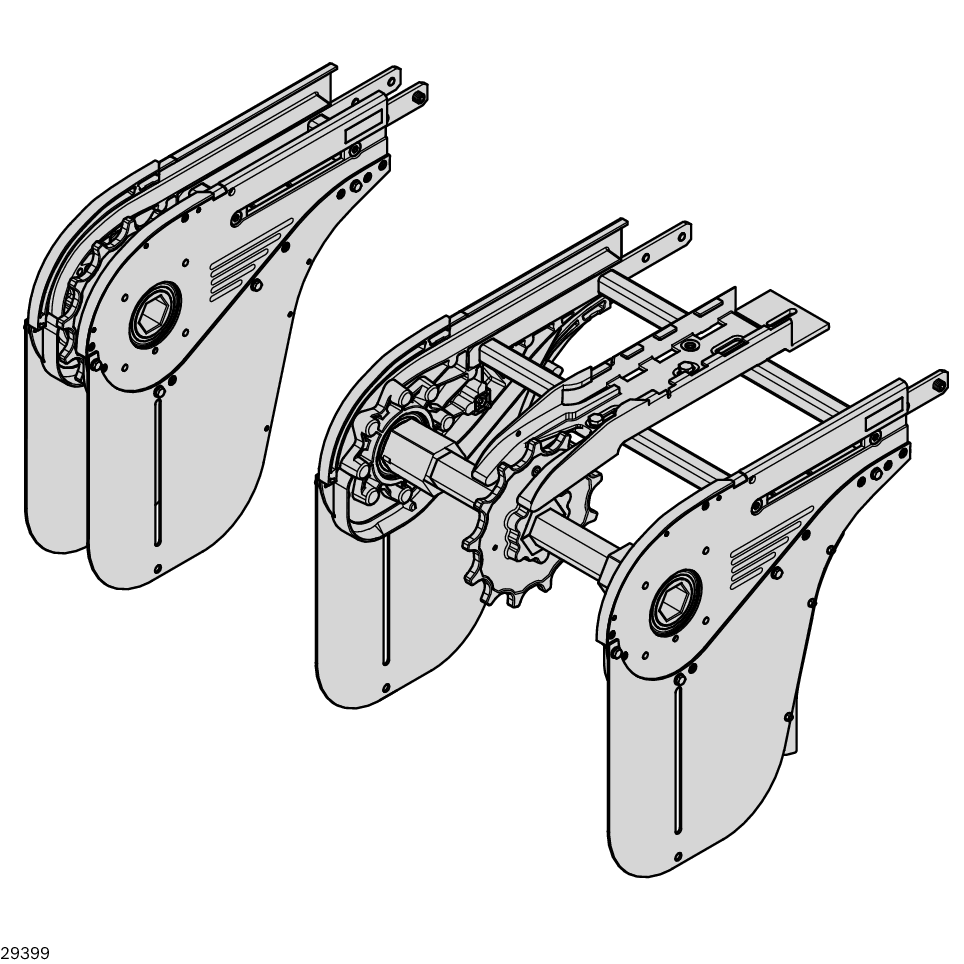 Unité de base AL, VFplus 65 dir.. Unité de base AL, VFplus 65 dir.. Unité de base AL directe + kit d'entraînement = entraînement de tête complet. Émissions sonores réduites grâce aux rails de glissement introduits dans l'entraînement de tête. Montage du kit d'entraînement (moteur, coupleur, bride) possible à droite/à gauche. Entraînement d'une section de convoyage parallèle ou d'un pont à l'aide d'un arbre hexagonal intégré de manière standard. Roulement à billes en acier inoxydable (1.4301), avec joint des deux côtés et garnissage de graisse conforme aux normes de la FDA. Réalisation de sections parallèles jusqu'à l'écartement zéro. Parties latérales avec rainure pour le montage de supports de guidages latéraux ou similaires. Afin d'éviter que la chaîne ne glisse en arrière dans les sections montantes, un pignon tendeur de chaîne est nécessaire