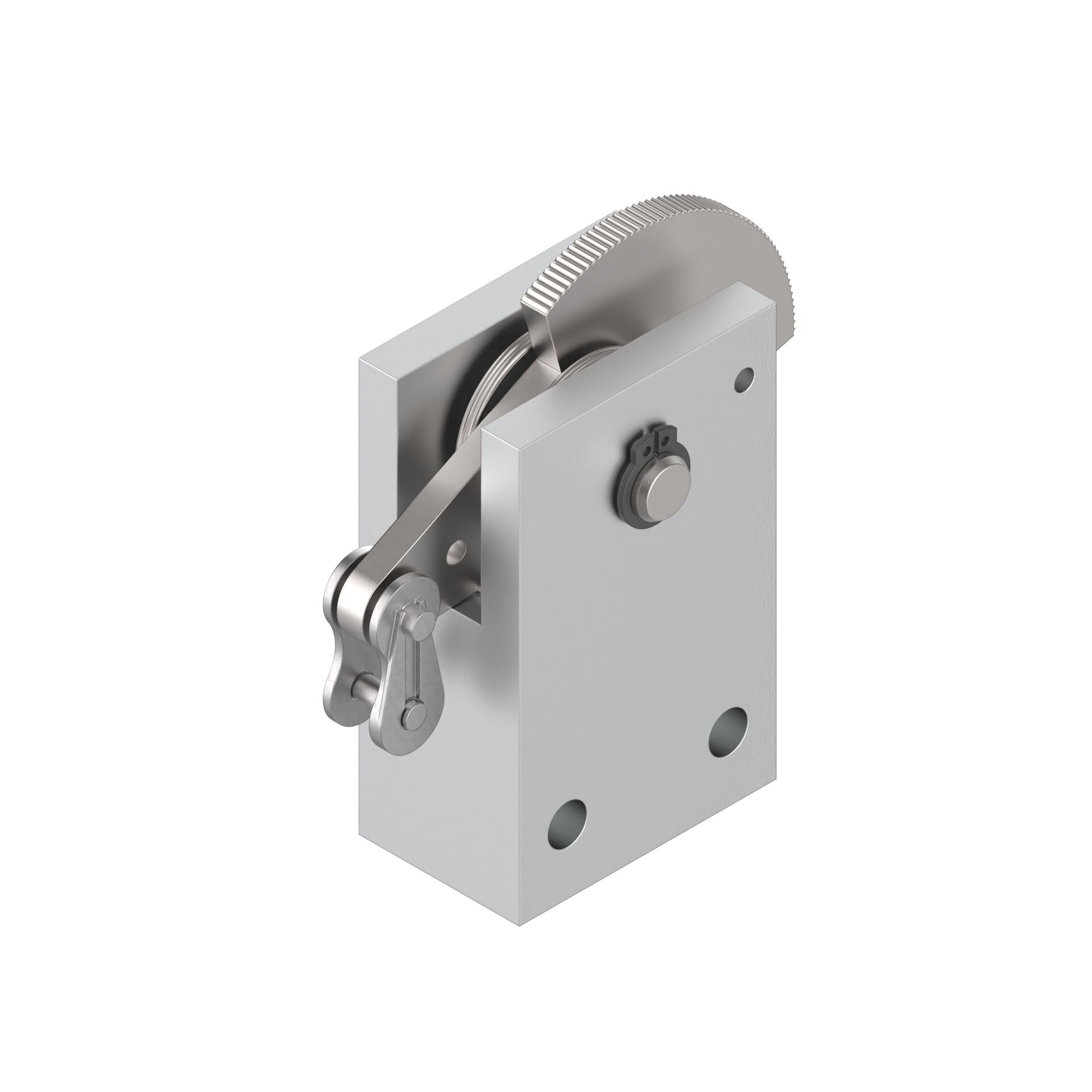Cliquet d'arrêt antichute. Cliquet d'arrêt antichute. En interaction avec d'autres éléments, le cliquet d'arrêt antichute sert à empêcher toute chute de la porte relevable en cas de rupture de câble. En cas de rupture de câble, la pièce pivotante du cliquet d'arrêt antichute se cale contre le palier de butée et s'encastre dans le profilé de guidage. Écartement entre le corps de base du cliquet d'arrêt antichute et le profilé de guidage latéral : 6 mm. Un cliquet d'arrêt antichute est requis par câble de traction :. – Charge max. par cliquet d'arrêt antichute : 250 N. – Charge min. par cliquet d'arrêt antichute : 25 N. Le palier-support (p. ex. patin. 3 842 530 303. ) doit être monté le plus près possible sous le cliquet d'arrêt antichute. Possibilité de montage sur des panneaux de garnissage disposant d'une rigidité suffisante, même sans cadre. Avant toute pose et toute utilisation, consultez la notice avec indications d'utilisation fournie avec le produit