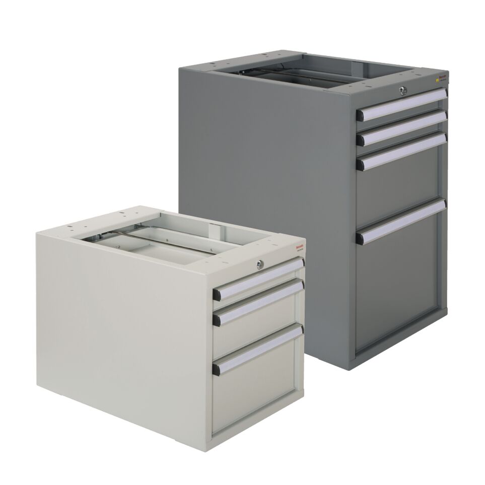 Armoire à tiroirs, deux tiroirs. Armoire à tiroirs, deux tiroirs. Tiroir avec glissière à billes pour une fermeture aisée et amortie ; fermeture automatique. Profil de manipulation ergonomique en aluminium avec zone d'inscription. Tiroirs à verrouillage centralisé. Charge admissible. – Par tiroir : 350 N. – Au total par armoire à tiroirs : 850 N. Version disponible avec conductibilité ESD. Montage (suspendu) :. – Au piètement de table. – Au plateau de table