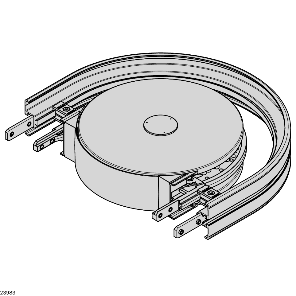 Courbe à disque AL VFplus 120 180°. Courbe à disque AL VFplus 120 180°. Roulement à billes en acier inoxydable (1.4301), avec joint des deux côtés et garnissage de graisse conforme aux normes de la FDA. Surfaces de contact avec la chaîne en matériau conforme aux normes de la FDA. Pas de contours perturbateurs au-dessus du niveau des plaques de chaîne. Utilisation horizontale et verticale (pour convoyeur à serrage) possible