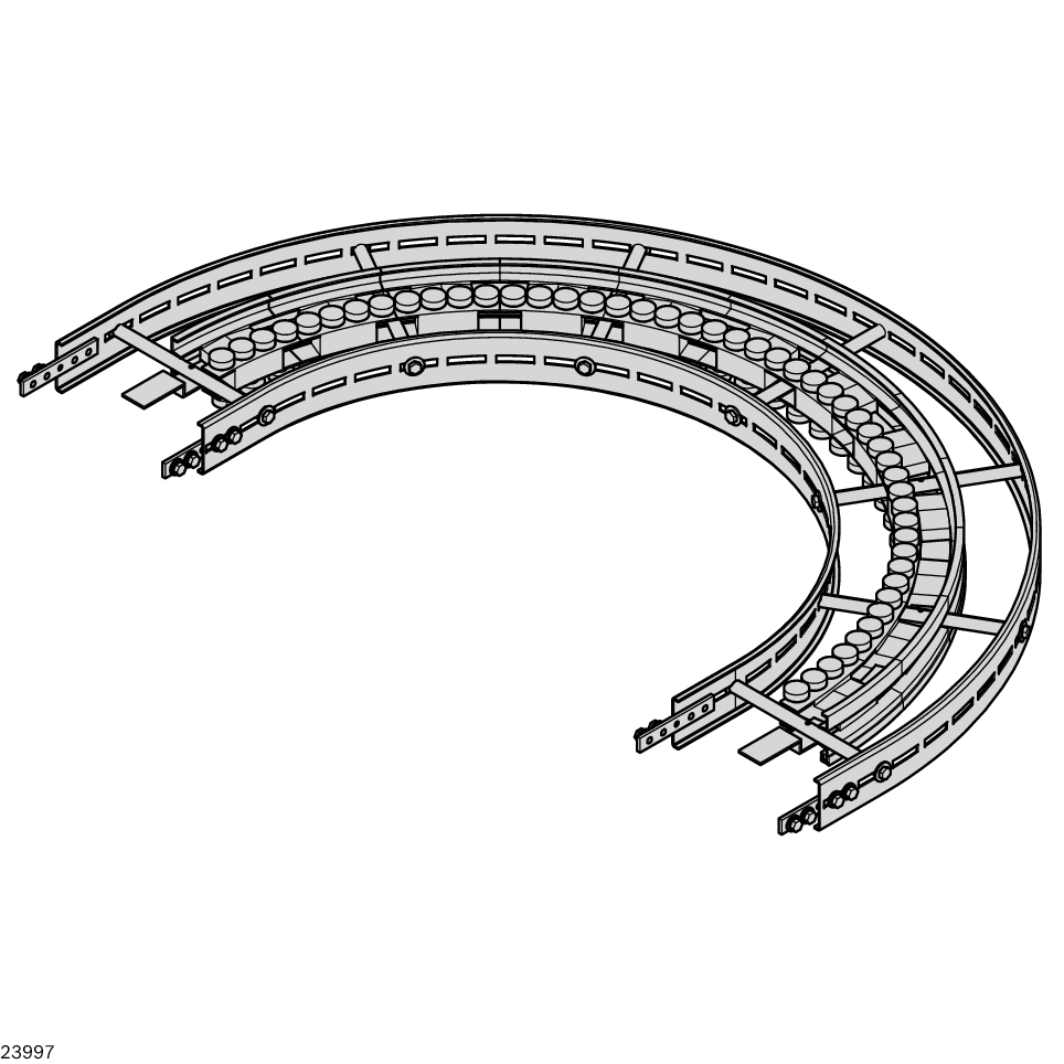 Courbe à rouleaux horizontale STS VFplus 160 180°. Courbe à rouleaux horizontale STS VFplus 160 180°. Éléments de rouleaux brevetés pour le changement de direction de la chaîne sans friction, à faible niveau sonore. Design permettant un nettoyage facile. Roulement à billes en acier inoxydable (1.4301), avec joint des deux côtés et garnissage de graisse conforme aux normes de la FDA. Surfaces de contact avec la chaîne en matériaux conformes aux normes de la FDA