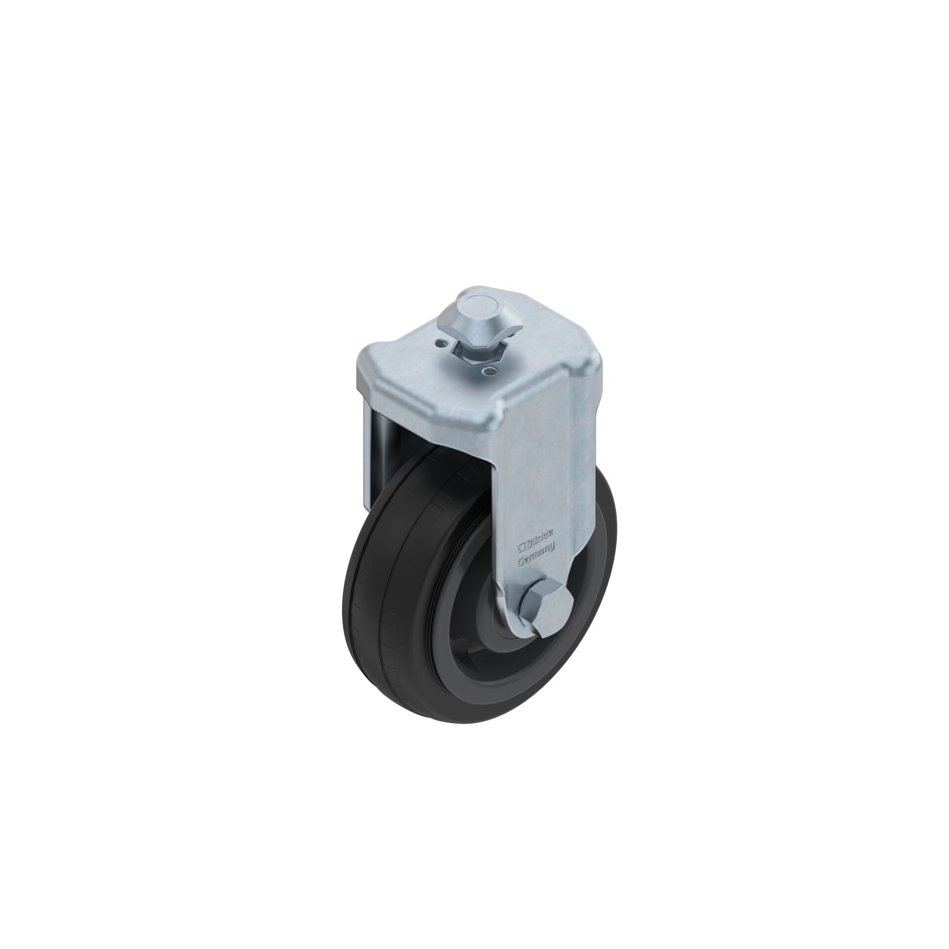 Roue fixe, caoutchouc plein, F600. Roue fixe, caoutchouc plein, F600. Caoutchouc de roulement en caoutchouc plein à reprise de forme élastique élevée. Pas d'écrasement durable de la roue lors du roulement sur des arêtes ou en cas d'immobilisation prolongée. Adapté aux zones sensibles ESD. Matériau conducteur selon DIN EN 61340-5-1 ; résistance de fuite ≤ 10. 6. Ω. Usage polyvalent. Roues présentant de très bonnes propriétés de roulement. Possibilité de monter le rouleau dans la rainure profilée ou dans l’alésage central de profilé (accessoires requis). Usinage des profilés : Taraudage M12 en cas de montage dans l'alésage central de profilé