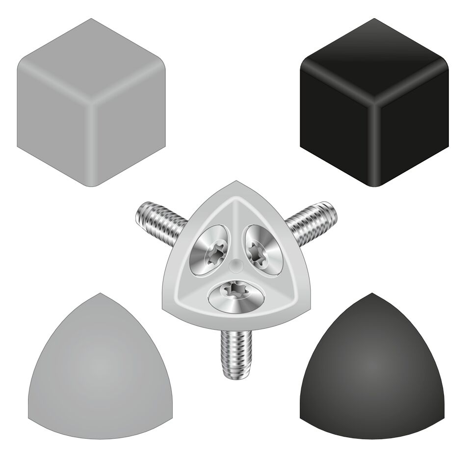 Cache cornière d'angle (cubique) R40x40, gris signalisation. Cache cornière d'angle (cubique) R40x40, gris signalisation. Cornière d'angle pour un raccord d'angle de 3 profilés carrés ou semi-ronds de section identique. Vissage au profilé par vis autotaraudeuses. Caches sphériques ou cubiques pour protéger contre les blessures et empêcher l'encrassement. Usinage des profilés : Inutile