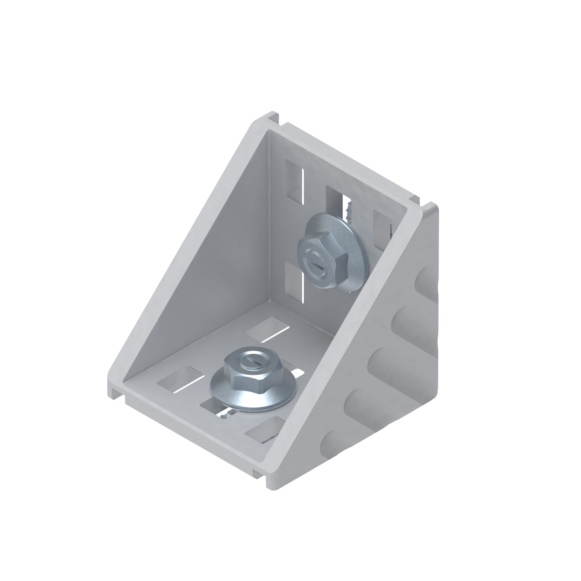 Jeu équerre 60x60 designLINE, rainure 10/10. Jeu équerre 60x60 designLINE, rainure 10/10. Équerre avec ergots de centrage permettant un montage rapide, précis avec sécurité antitorsion. Pour le montage sur plaques ou en travers de la rainure, il suffit de rompre les ergots de centrage. Version. designLINE. avec vernis argenté spécial (RAL 9006) pour un design de grande qualité. Pièce intermédiaire pour le positionnement d'équerres dans la rainure directement supérieure. Cache de protection contre l'encrassement, disponible en modèle gris signalisation (RAL 7004) et noir ESD (RAL 9005). Usinage des profilés : Inutile