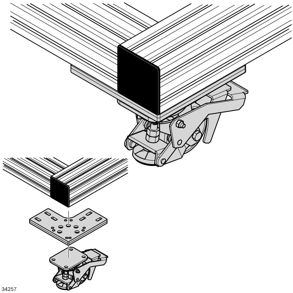 Roue élévatrice - Pédale rotative. Roue élévatrice - Pédale rotative. Roue élévatrice orientable. Par la simple inversion du levier d'arrêt la roue devient un pied stable. Le frein se déplace avec la roue. En cas de besoin, il est possible de faire pivoter le frein sous le bâti